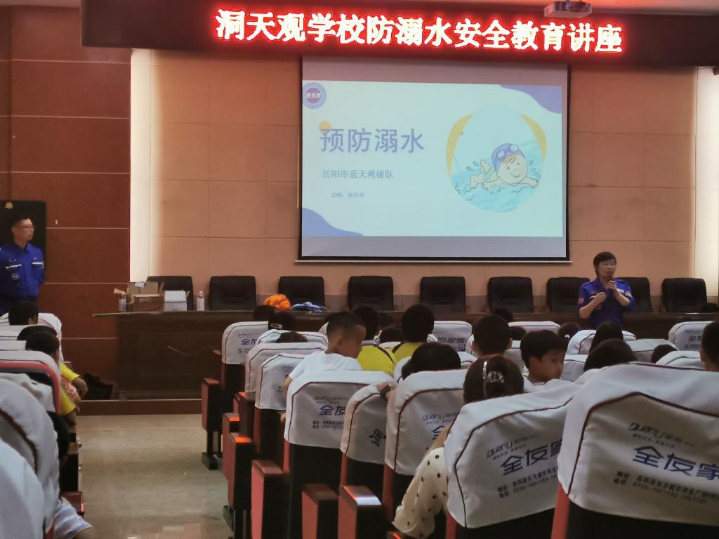 下午,老师们会同岳阳市蓝天救援队的队员一起来到岳阳县洞天观小学开展社会服务和主题调研。学校礼堂里,300多名小学生听取了会员陈玲玲老师(同时担任岳阳市蓝天救援队专业讲师)所做的题为“防溺水安全教育”专题讲座。当看见全副武装的队员老师走上讲台的时候,孩子们欢呼雀跃,陈老师给孩子们生动地讲授了落水自救的方法,老师学生互动热烈,不一会儿就送出六十多份奖品。此前,支部通过与学校领导交流,了解到随着夏季到来,学校急需对小学生进行防溺水安全教育,因此特邀岳阳市蓝天救援队参加本次活动,取得了良好效果。