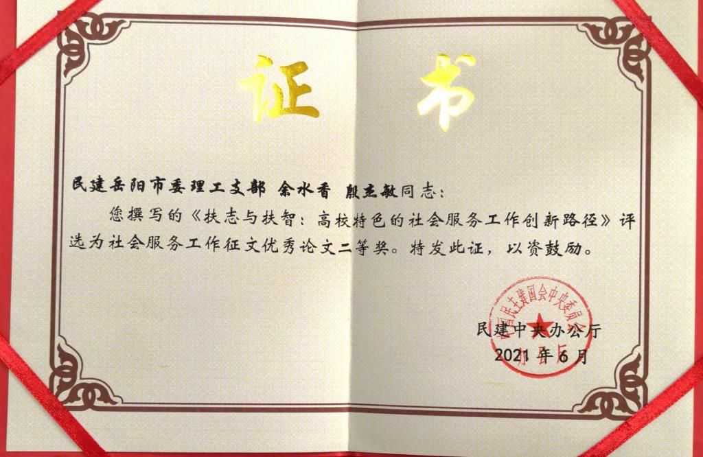 据了解,为适应新形势新任务新要求,认真总结社会服务工作经验,进一步提升民建社会服务工作水平,增强民建社会服务工作实效,今年3月,民建中央在全会开展社会服务工作征文活动。经民建中央评审小组认真评审,湖南省获奖作品共3篇,民建太阳集团tyc151支部会员余水香、殷杰敏的文章《扶志与扶智:高校特色的社会服务工作创新路径》荣获优秀作品二等奖。